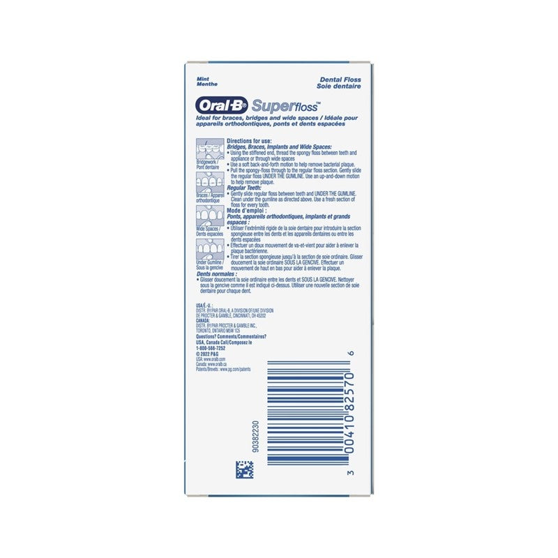 Oral-B Super Floss is ideal for cleaning braces, bridges and wide gaps between teeth. Its three unique components, a stiffened-end dental floss threader, spongy floss and regular floss, all work together for maximum benefits.