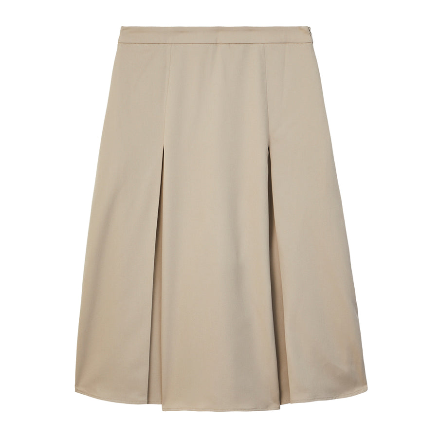 This Cultivation Under Knee Length Skirt in Khaki offers versatile elegance suitable for both casual and formal occasions. Pair it with a tailored blouse or fitted top for a polished, professional look, or combine it with a relaxed shirt or sweater to achieve effortlessly chic casual style. Its classic cut enhances silhouette refinement, making it a timeless addition to your wardrobe.
