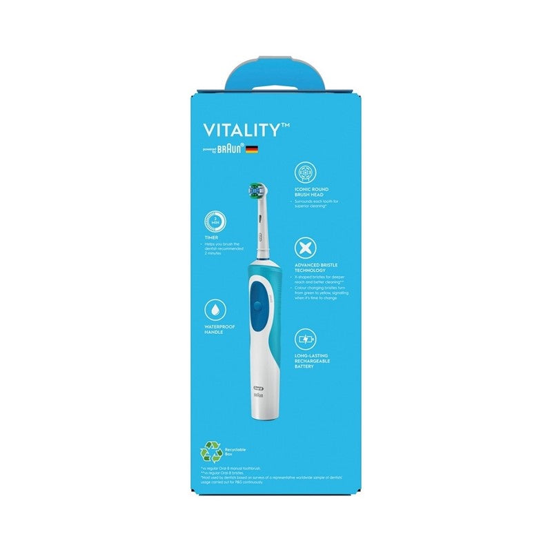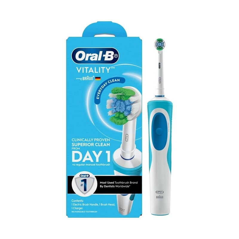 The Oral-B Vitality Precision Clean electric toothbrush provides a clinically proven superior clean vs. a regular manual toothbrush. The round shape of the Precision Clean toothbrush head is designed to clean tooth by tooth, and 2D cleaning action oscillates and rotates for better plaque removal than a regular manual toothbrush. There is one mode Daily Clean and a pressure sensor to alert you if you brush too hard, plus an in-handle timer helps you brush for a dentist-recommended 2 minutes.