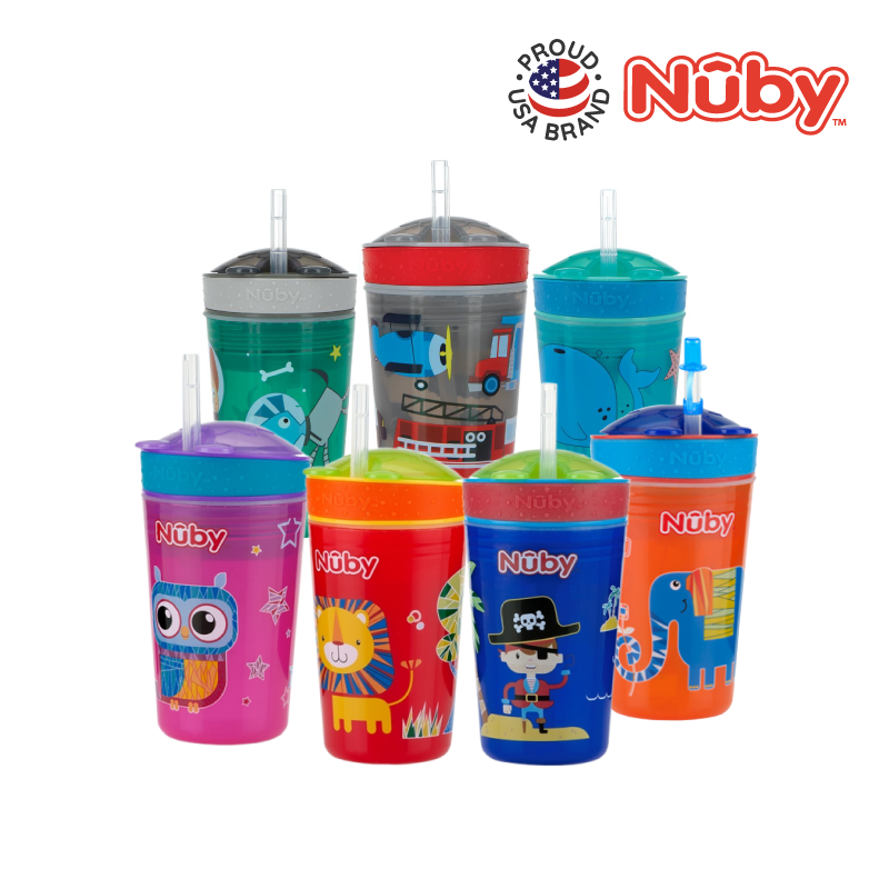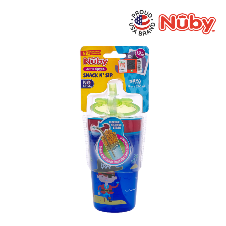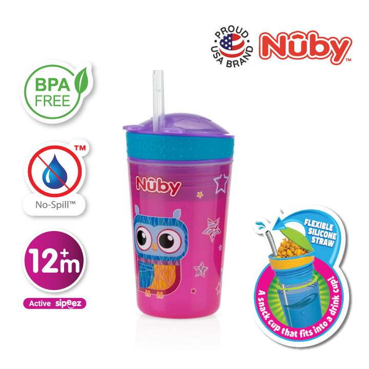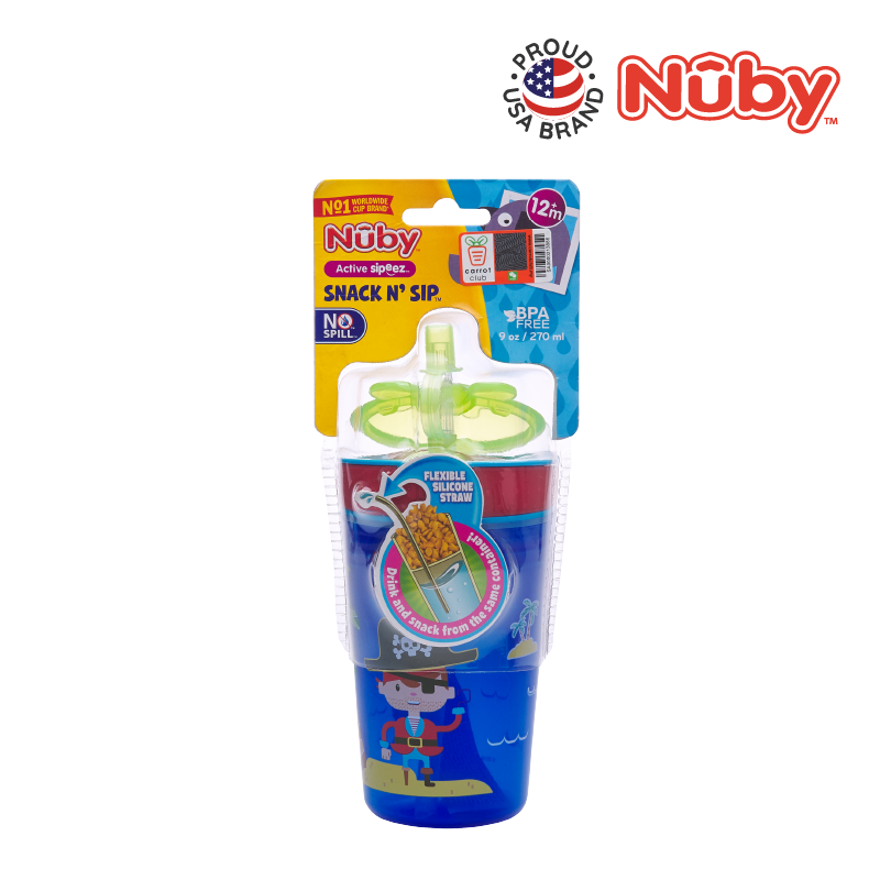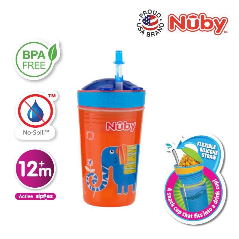 Nûby’s new Snack N’ Sip™ range of cups allows your child to eat and drink from the same container! This revolutionary design is made for the parent on-the-go and is great for day picnics, hikes, and your child’s recreational activities! The soft silicone straw is uniquely designed to prevent drips and spills while being delicate and gentle to gums and teeth. All Nûby™ products are made of safe, materials. Made from durable, break-resistant plastic.