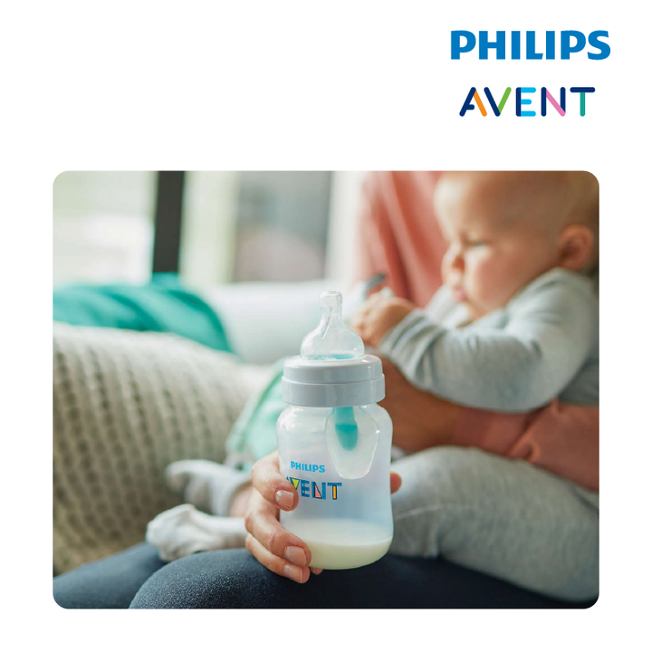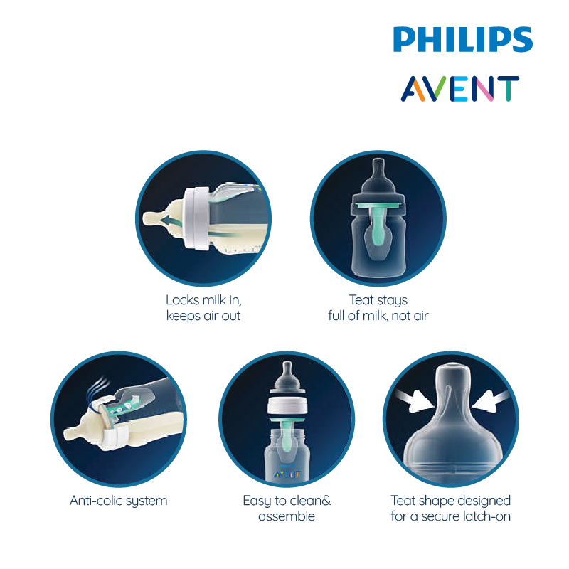 The AirFree™ vent is designed to help your baby swallow less air. The teat stays full of milk, even when horizontal, for upright feeding. Reducing the air a baby ingests can help ease common feeding issues like colic, gas and reflux.