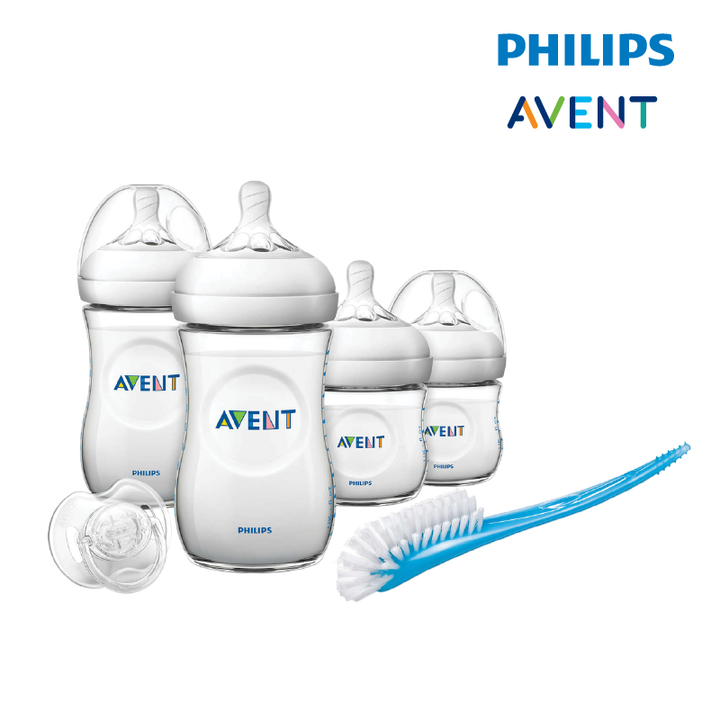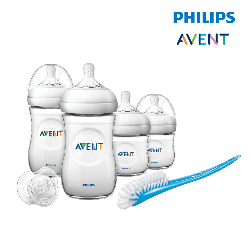 The handy collection SCD371/00 by Philips Avent including 4 Classic+ feeding bottles (2x 4oz and 2x 9oz), a bottle and nipple brush, and a white translucent pacifier 0-6 months.