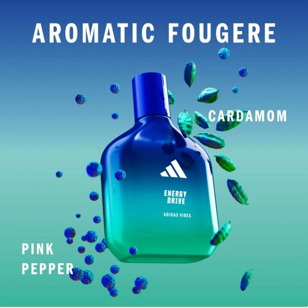 Feel the vibe and feel energised with the new adidas fragrances. Vibes Energy Drive Eau de Parfum is proven to make you feel positive*. Empowering and luminous, like that unstoppable burst of energy, when nothing can get in your way. With Cardamom and Pink Pepper. The long lasting fragrance, with Orange & Pink pepper natural essential oils, has a vegan formula and is dermatologically tested.