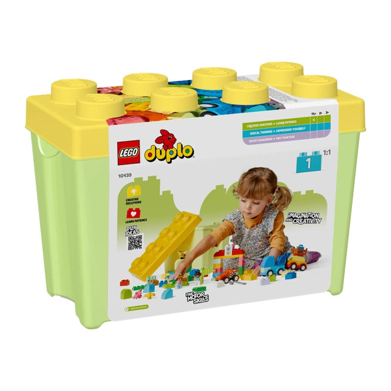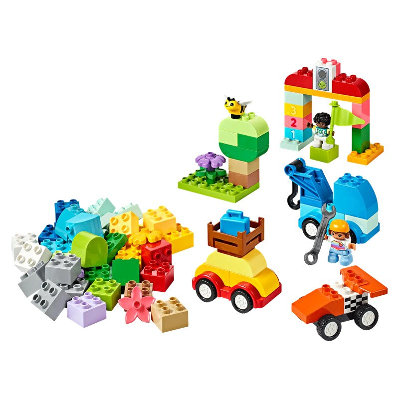 Toddlers who love vehicle playsets build creative skills with the Cars and Trucks Brick Box (10439) educational toy. With 3 wheelbases and 80 bricks, this creative building set lets preschoolers aged 18 months and up construct a race car toy and podium, tow truck, family car and countryside scene – or any other wheeled wonders they can dream up!