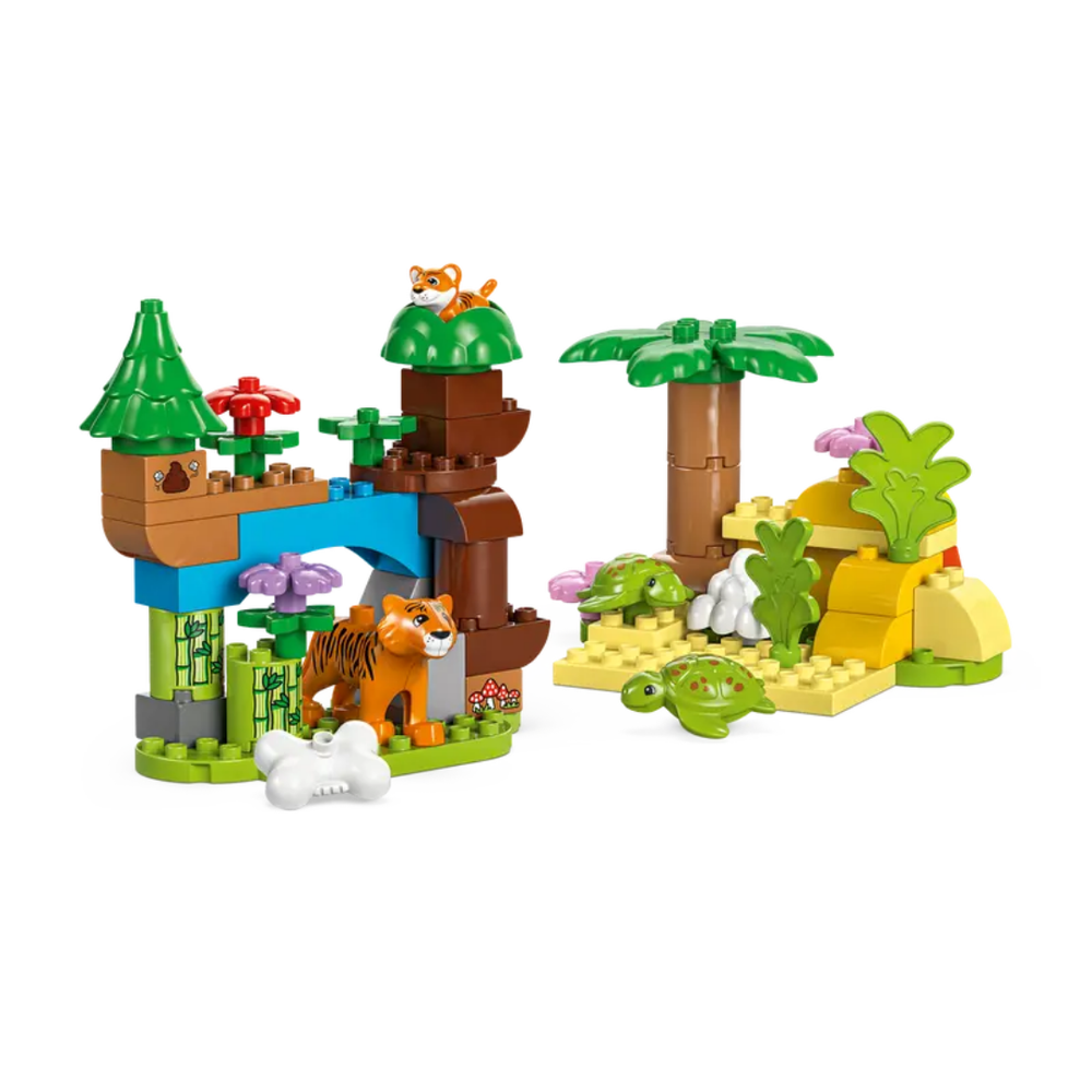 This toddler toy features a savannah scene where a tigress and a tiger cub figure feed on a bone then play on the rocks, and an elephant figure leads its calf to a waterfall. Toddlers use fine motor skills as they clip the baby to the adult elephant’s tail.At the beach the turtles figures are laying eggs. In the forest the panda figure and its cub play under the cherry blossom, while cute deer figures graze in the glade.