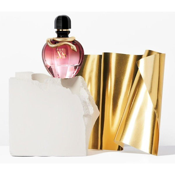 Pure XS perfume for her. Excess in a pure state. A floral fragrance with explosive sensuality. The ylang flower releases its carnal instinct into the leathery warmth of vanilla. Indecent... Fusion of popcorn. Addiction. And maddened senses... Notes of blown grain, musk, and milkwood, melting with the skin. Pure desire.