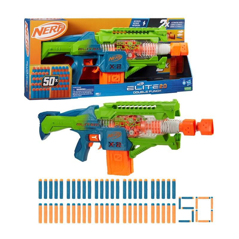 - NERF elite 2.0 double punch motorized blaster with rapid alternating barrels: double barrels! the NERF elite 2.0 double punch blaster features 2 barrels that rapidly move back and forth as you fire.