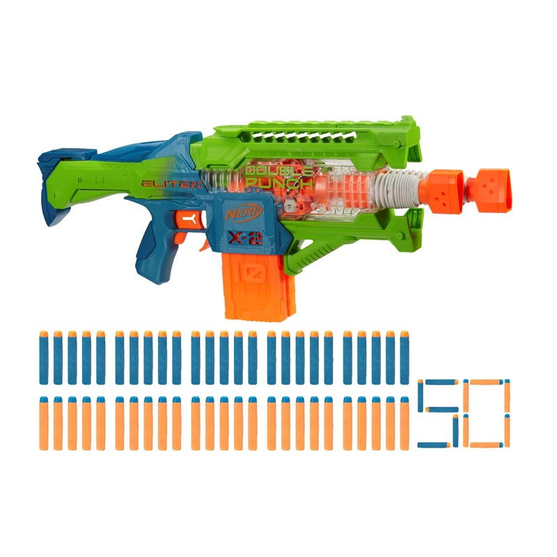 - 50 NERF elite 2.0 darts: the double punch NERF blaster pack includes 50 NERF elite darts in 2 colors.