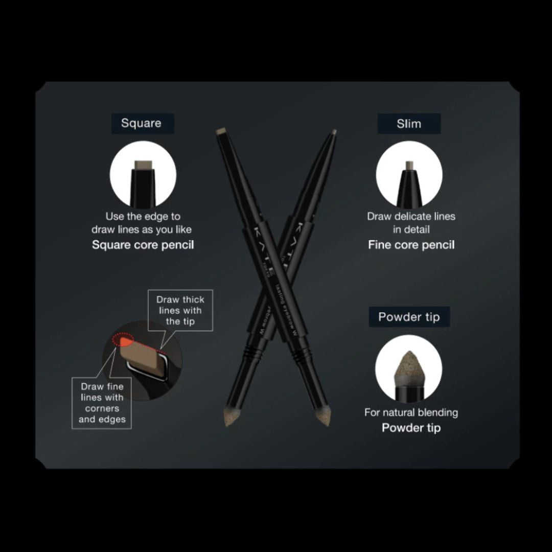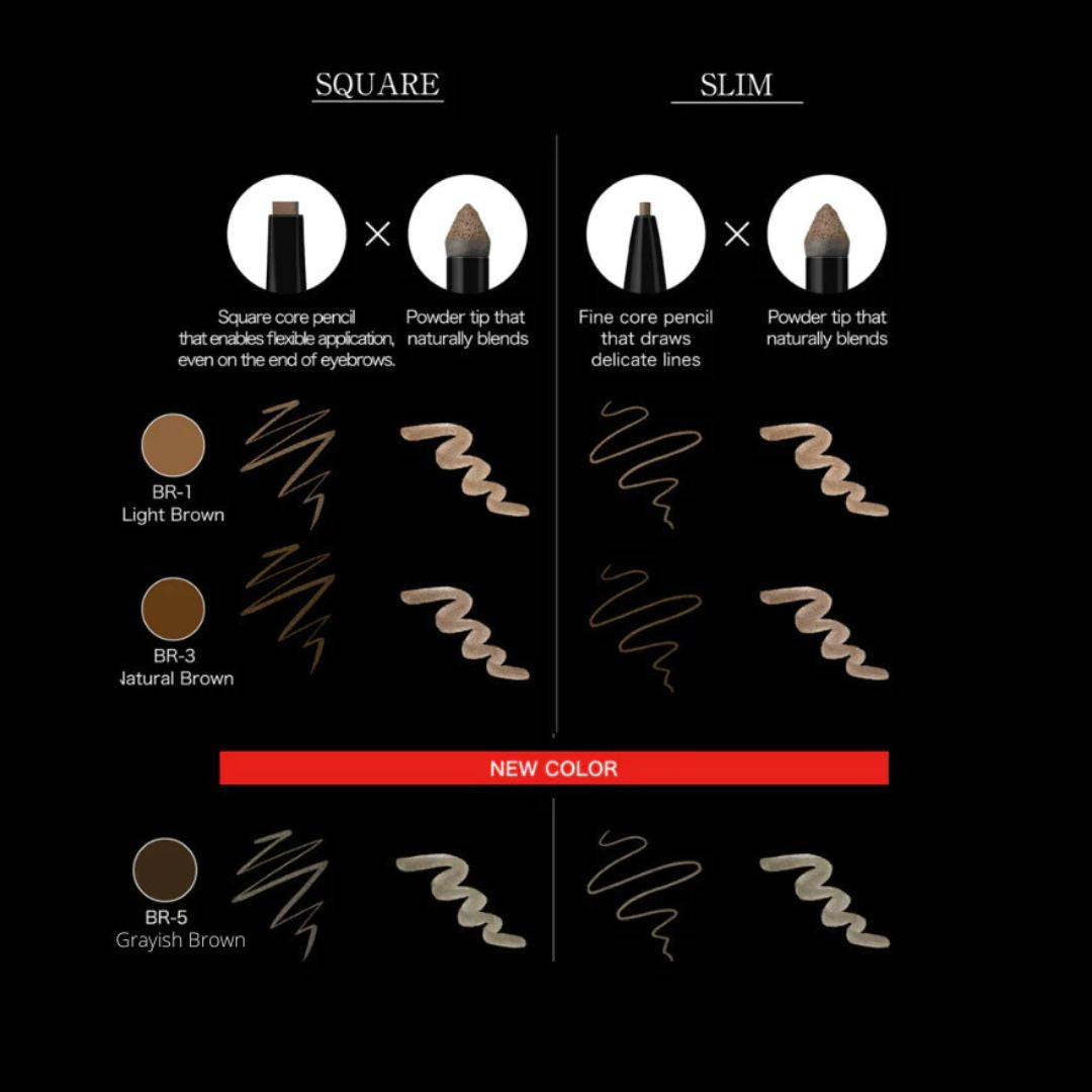 A double-ended eyebrow pencil that draws lines of any thickness and eyebrow powder for natural blending. Easily creates natural contoured eyebrows.