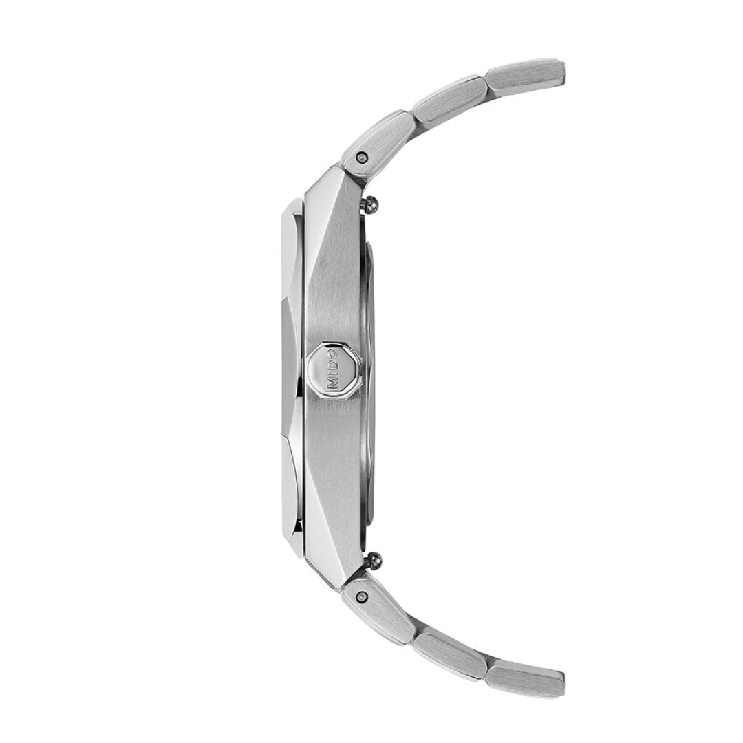 With its clean lines, balanced 40 mm case and distinctive octagonal bezel, the Multifort 8 One Crown showcases a bold and contemporary design. Its dial, structured with horizontal grooves, plays with rhythm and depth, while Super-LumiNova® ensures perfect legibility. A double-sided anti-reflective sapphire crystal protects the dial, enhanced by a satin-finished steel case with polished edges. Powered by the Caliber 80 – a Swiss automatic movement with extended autonomy, visible through the transparent case back – this timepiece reflects MIDO’s vision of TECHNOMETRY: a harmonious fusion of technology and geometry. Robust, precise and stylish, the Multifort 8 One Crown is made for those who demand excellence with character.
