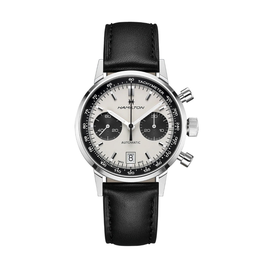 The Hamilton Intra-Matic Auto Chrono is a modern reworking of a 1968 signature piece that offers a sporty but classic look. Combining authentic 60s appeal with the exclusive H-31 automatic movement, its distinctive panda dial is a guaranteed eye-catcher.