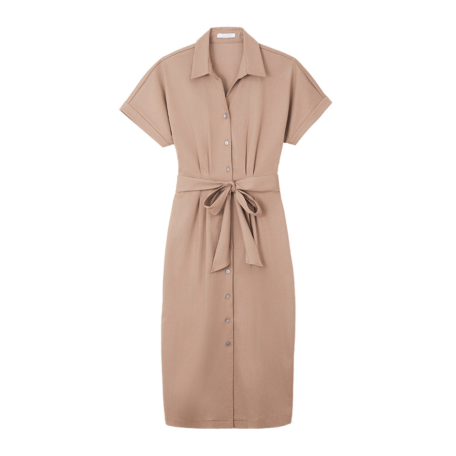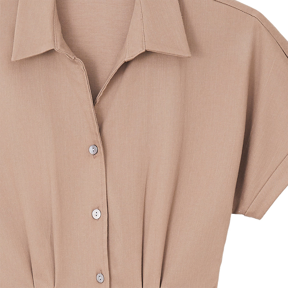 This brown semi-formal dress features a button front design and a waist ribbon that accentuates your silhouette with subtle elegance. Its structured collar and short sleeves blend professionalism with comfort, making it an ideal choice for office wear. The dress combines refined details with a polished look, ensuring you present a confident, sophisticated appearance throughout your workday.