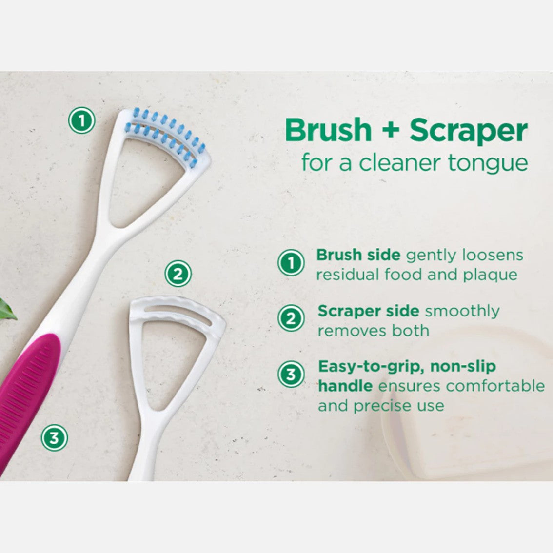 - Dual functions - 2-in-1 brush and scraper design effectively removes dirt on tongue surface