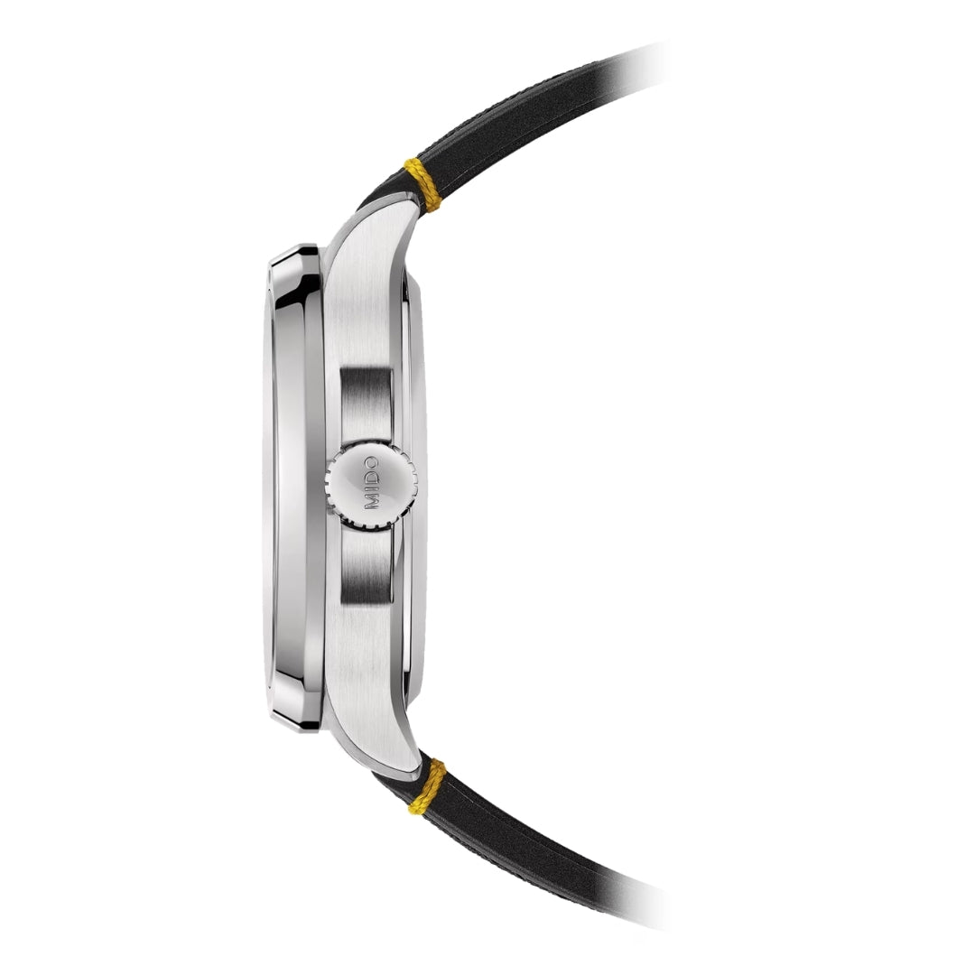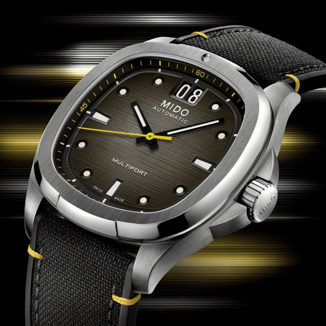 A brilliant flashback! Born from MIDO's extraordinary heritage, the TV-shaped case returns to centre stage for the Multifort TV Big Date, as intense as it is precise, thanks to its formidable mechanical movement. The modern and dynamic design of this Swiss watch is highlighted by a striking dial and, along with its distinctive function: the BIG DATE at 12 o'clock. Its formidable latest-generation automatic movement, Caliber 80, is equipped with a high-tech balance spring in Nivachron™, which offers outstanding resistance to shocks and magnetic fields.