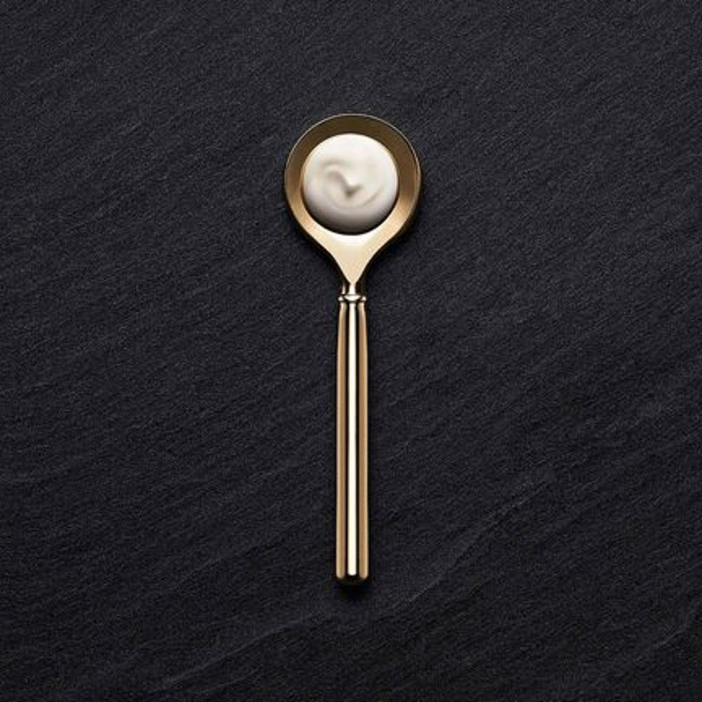Apply morning and evening after face essence application. Using the golden spoon, swipe a small amount onto fingertips. Using the ring finger, dot the cream under the eye from the temples to the inner corner, continuing under the brow line back to the temple to complete a full circle around the eye area. Repeat the pattern with a gentle smooth motion of the fingertip to help the eye cream absorb. Follow with the face serum and moisturiser of La Prairie Pure Gold collection. In the morning, finish your skincare ritual with UV protection.