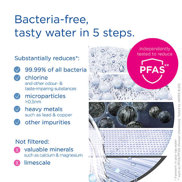- Pure tasting water, naturally filtered. The activated carbon made from coconut shells is proven to reduce PFAS*