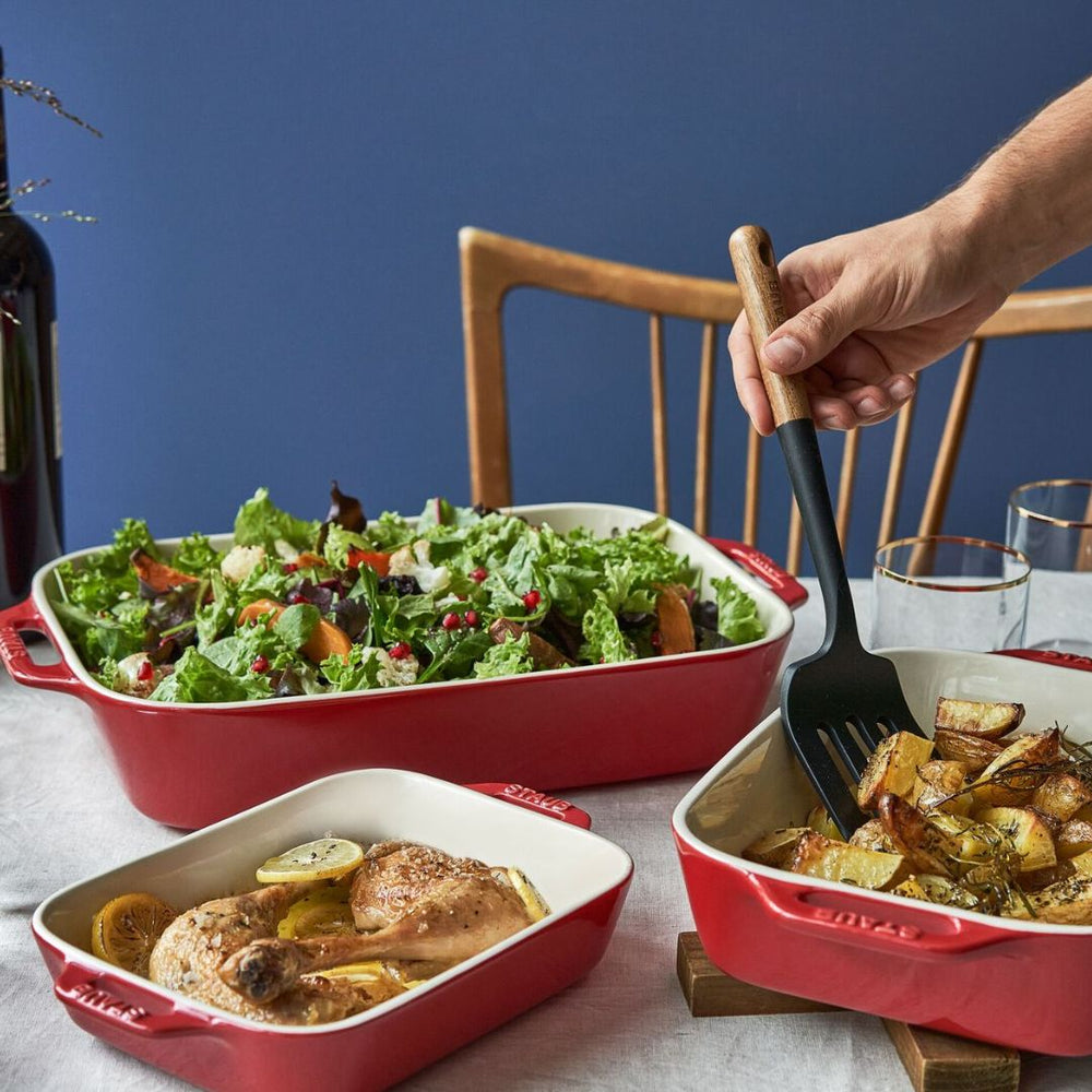 This baking dish set features three nestable rectangular bakers for all your sweet and savory baking needs, whether you’re cooking for a crowd or just for two. STAUB stoneware bakers gently retain heat and won't absorb moisture, producing a delicious result for all your favorite recipes. The comfortable, large handles make maneuvering hot dishes easy. Ideal for lasagna, casseroles, and desserts, as well as roasted meats and vegetables, these bakers are essential dishes in the kitchen.