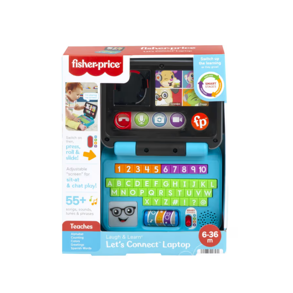 Baby's ready to play and learn from home (or wherever they go) with the Laugh & Learn Let's Connect Laptop electronic toy from Fisher-Price. Between pretend video chats with Puppy and friends and sliding to 'unmute,' baby can press the buttons on the keyboard or spin the musical roller to activate fun multi-color lights and 55+ songs, sounds and phrases about the alphabet, colors, counting and more. And with 3 Smart Stages levels, you can switch up the learning fun as your little one grows.