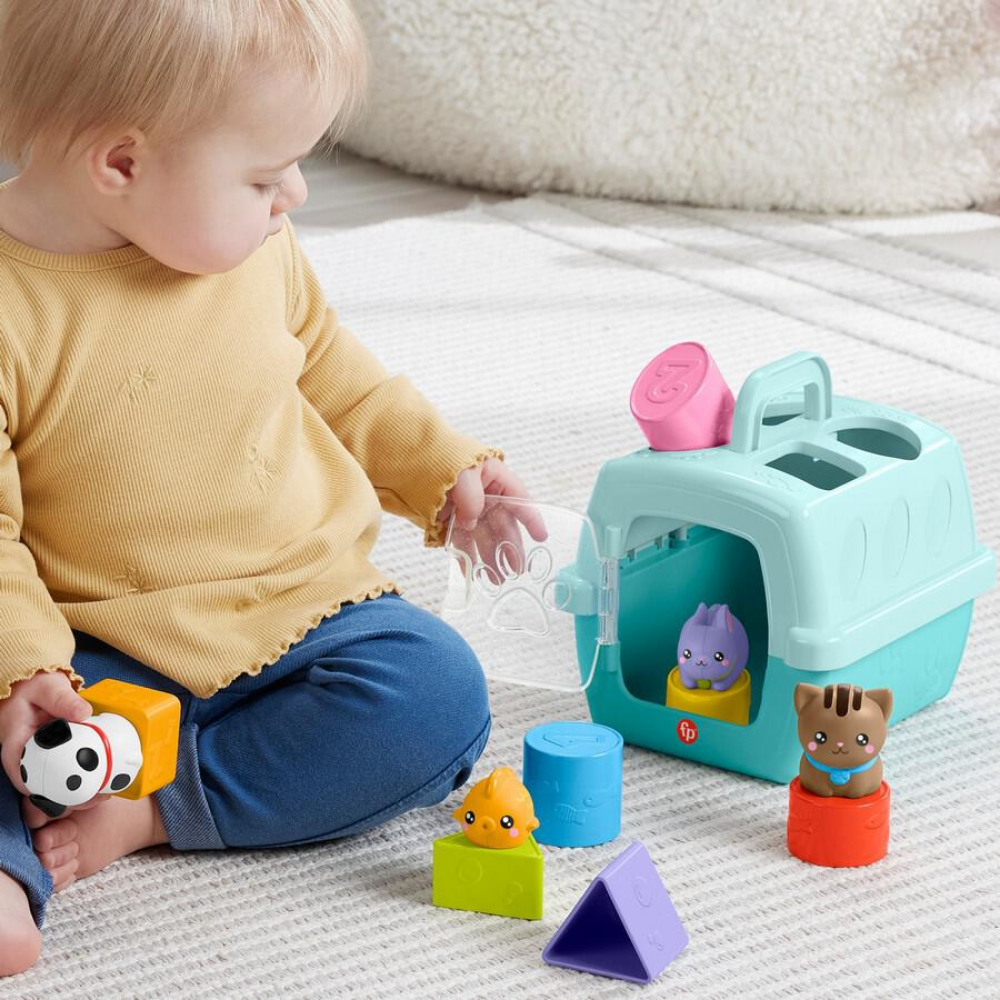 Little pet lovers will have a paws-itively fun time with the FP Pets™ Sort & Stow Pet Carrier™ shape sorting toy from Fisher-Price®. This baby toy includes adorable pet-themed, and shape blocks that kids can sort into the corresponding slots of the pet carrier. Empty the carrier through the door to start over again! This toy helps foster fine motor and problem-solving skills as kids play. Plus, the easy-to-hold handle lets kids take their pets to the vet for realistic role-play. Colors and decorations may vary.