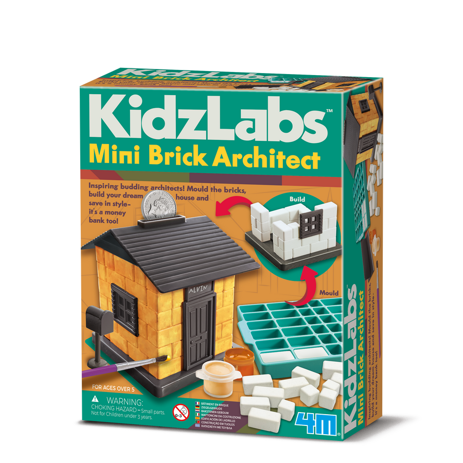 Inspiring budding architects! Mould the bricks, build the house, and save in style--it's a money bank too! his kit contains plaster powder, a brick mould, a 9 pc set of house parts, and other materials to make a mini house and money bank that measures 9 cm tall and 8 cm wide. Kids can personalise it by writing on the name plate.