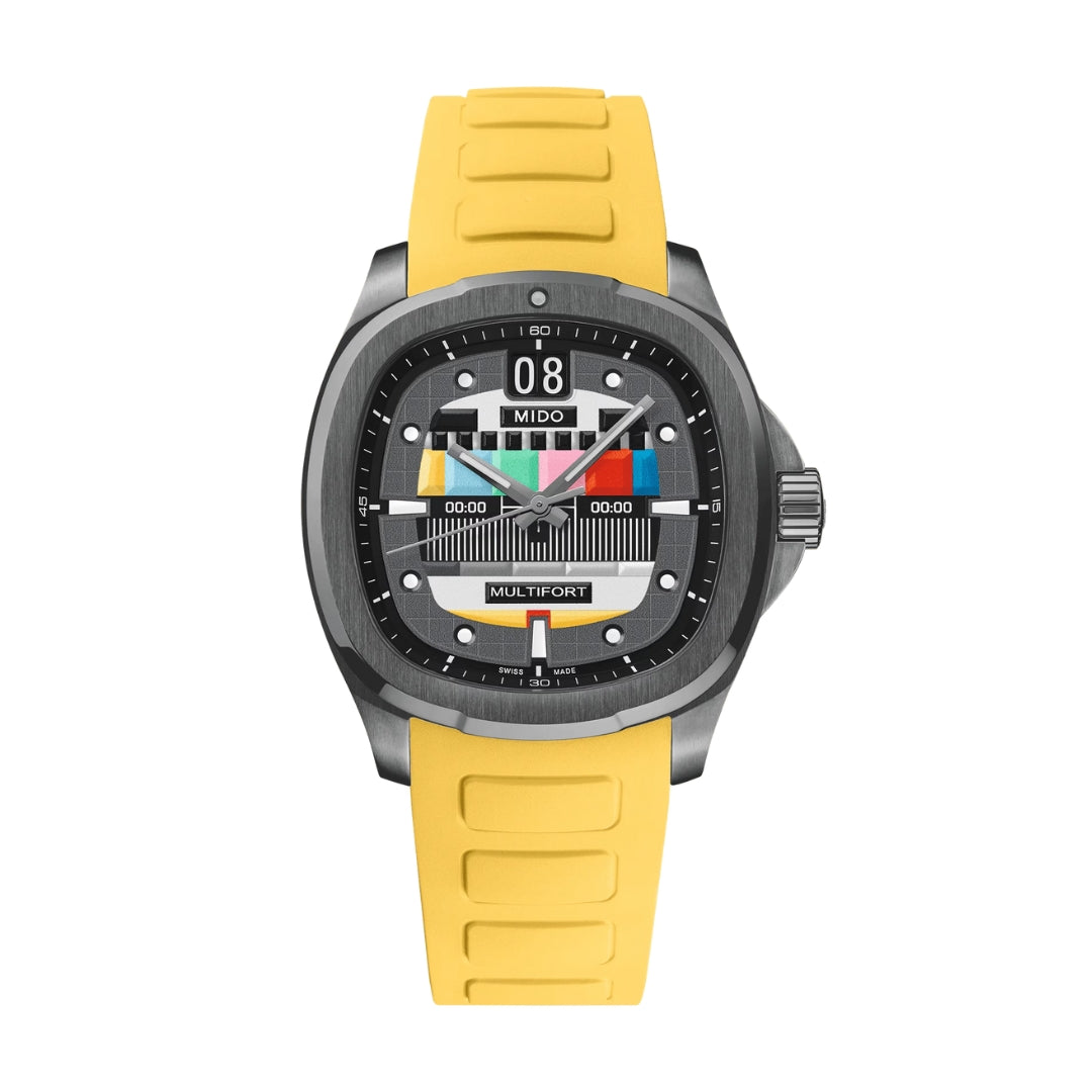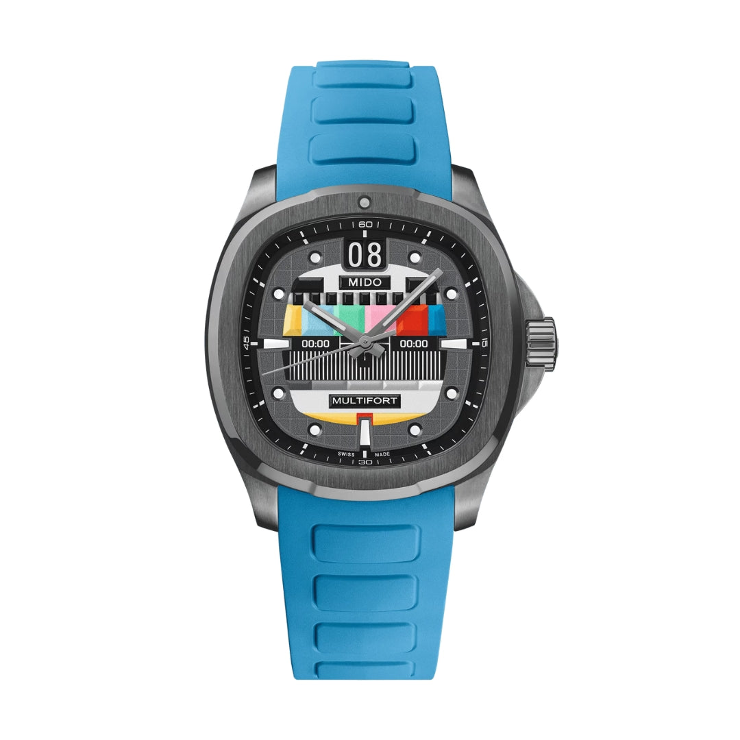 A brilliant flashback! Born from MIDO's extraordinary heritage, the TV-shaped case returns to centre stage for the Multifort TV Big Date, as intense as it is precise, thanks to its formidable mechanical movement. The modern and dynamic design of this Swiss watch is highlighted by a striking dial and, along with its distinctive function: the BIG DATE at 12 o'clock. Its formidable latest-generation automatic movement, Caliber 80, is equipped with a high-tech balance spring in Nivachron™, which offers outstanding resistance to shocks and magnetic fields.
