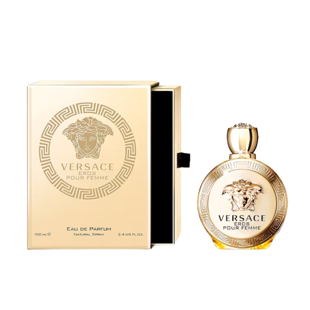Eros Pour Femme Eau de Parfum is a captivating fragrance that embodies strength, individuality, and seduction. The fragrance is housed in a golden bottle adorned with Greca engravings and a central Medusa.