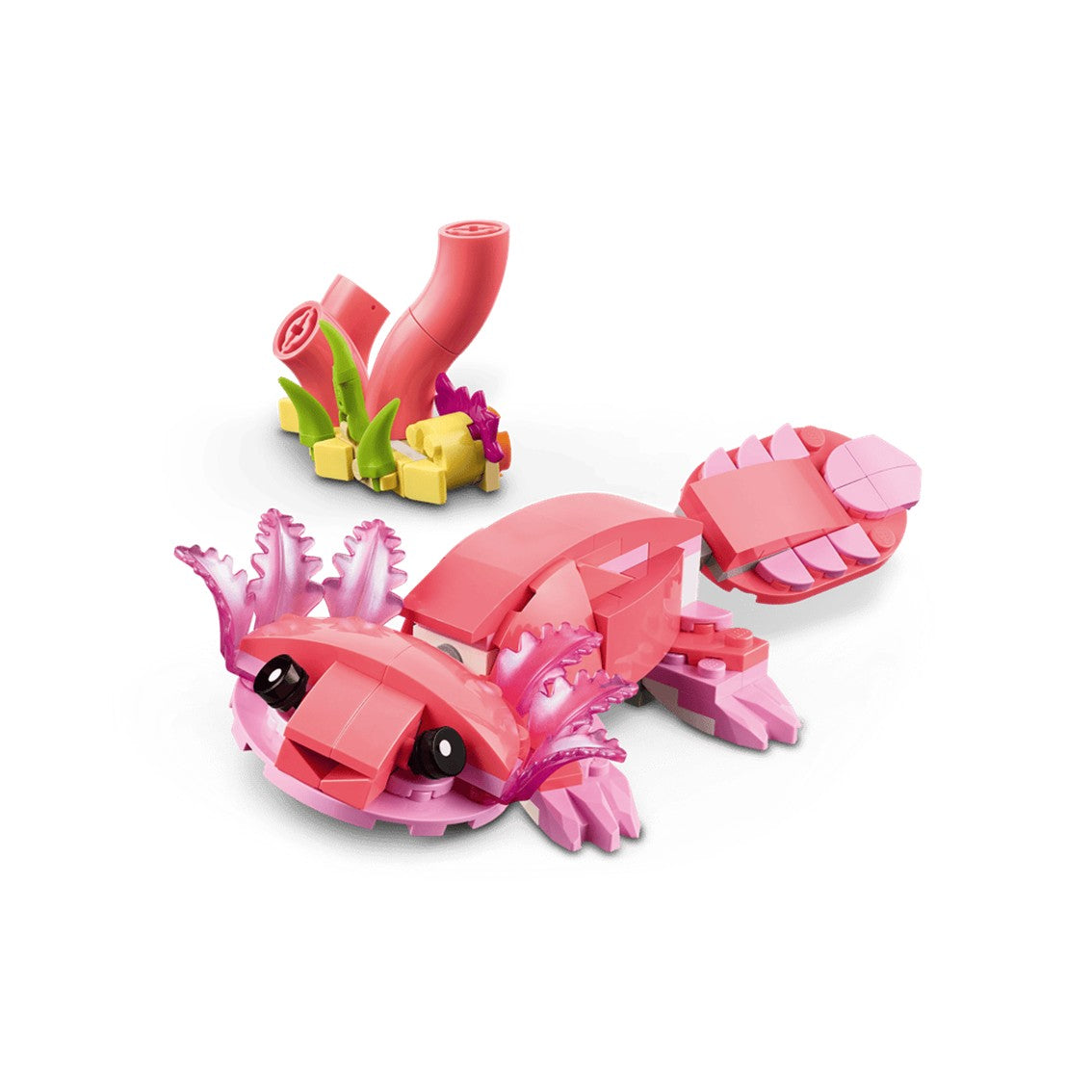 This LEGO set gives kids 3 different building options using the same bricks: a pink flamingo toy with a posable head on a plant-covered stand, a posable pink cockatoo toy, which can rotate its head 360 degrees, or an adorable posable pink axolotl toy with underwater plants. All 3 cute LEGO animal transforming toys make fun gifts for kids.