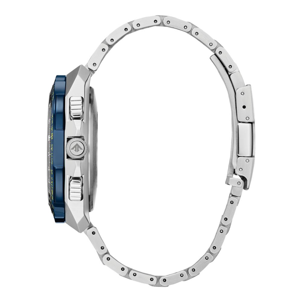 The mission of the Blue Angels is to showcase the pride and professionalism of the U.S. Navy and Marine Corps through their expert precision and dedication to excellence and service. This exceptional timepiece has a silver-tone stainless steel case with a blue ion-plated bezel, yellow inner bezel, and blue dial encased in sapphire crystal.