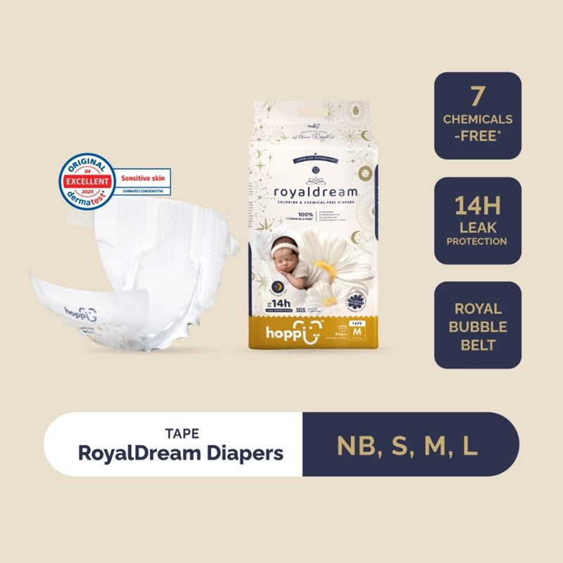 Chlorine & Chemical Free Discover the Softest Premium Diaper with Royal Dream. Specially crafted for newborns and babies with sensitive skin, these diapers offer gentle protection without chlorine or harsh chemicals. Engineered with fast-absorbing technology, Royal Dream locks in moisture within seconds, providing up to 14 hours of reliable leak protection. The Royal Bubble Belt (Pants) ensures a snug yet breathable fit, while calendula extract delivers a soothing touch for delicate skin. Give your baby the comfort they deserve with Royal Dream – the Softest Premium Diaper for overnight protection.